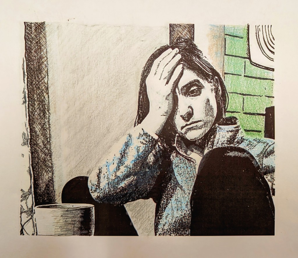 A man seated on the ground—one knee up, head bowed, one hand to his forehead as if bracing himself. His whole posture says it: the world is too much right now.