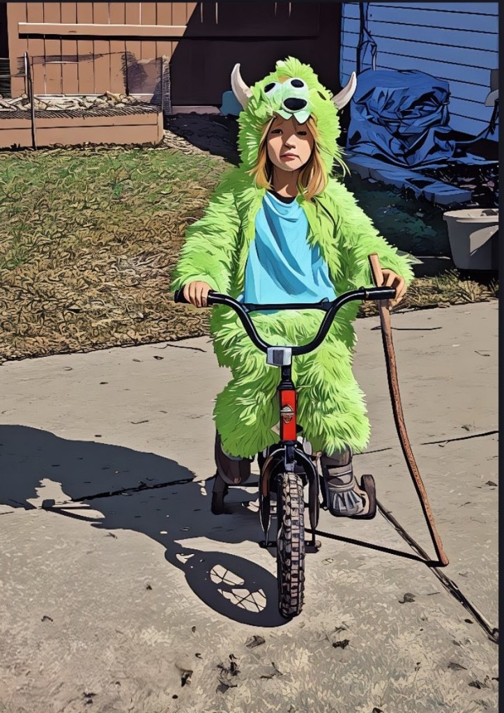 The suit was green and fuzzy, with soft horns that bobbed as she pedaled her bike in slow, proud loops.